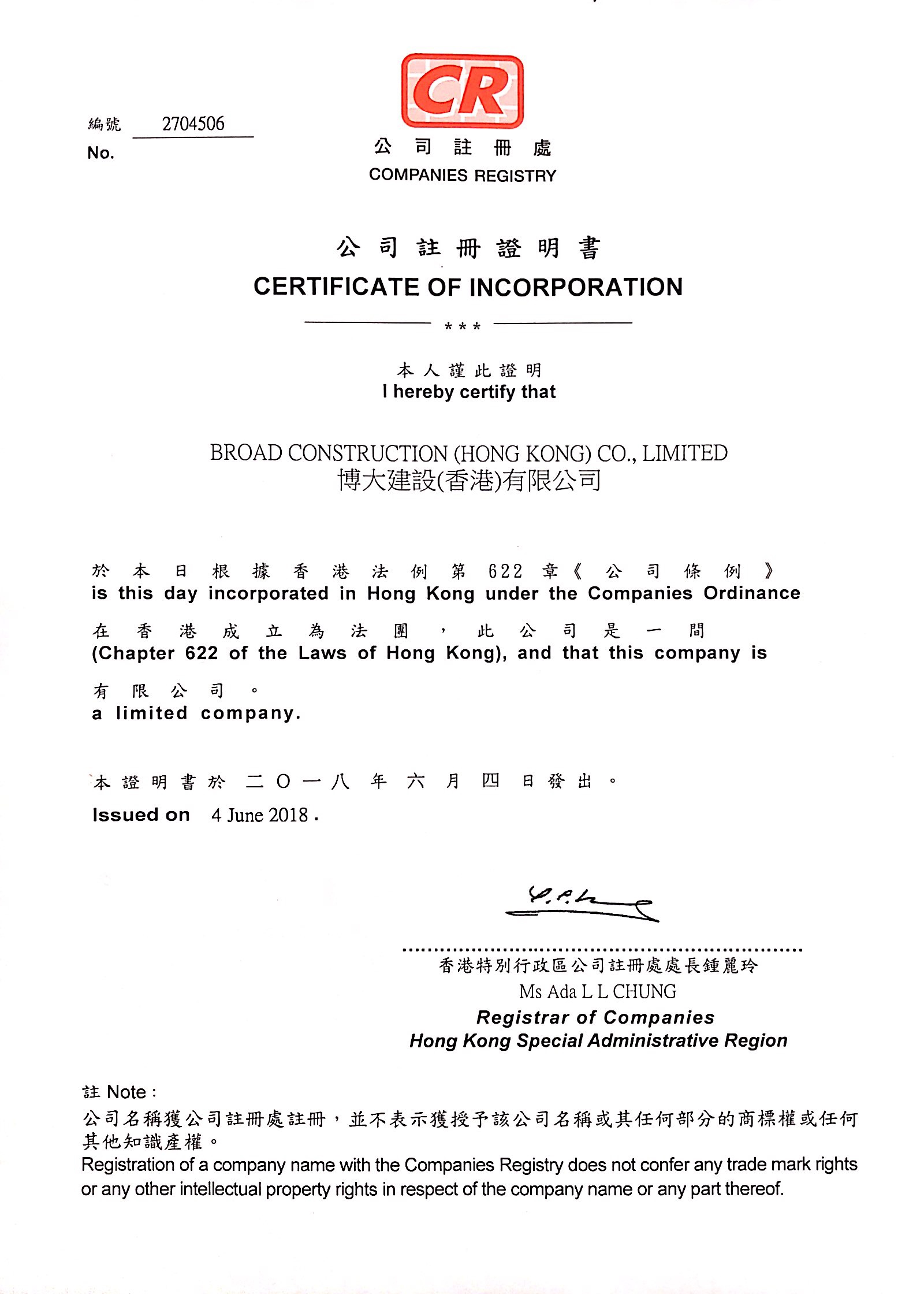 博大建設(shè)(香港)有限公司注冊證書