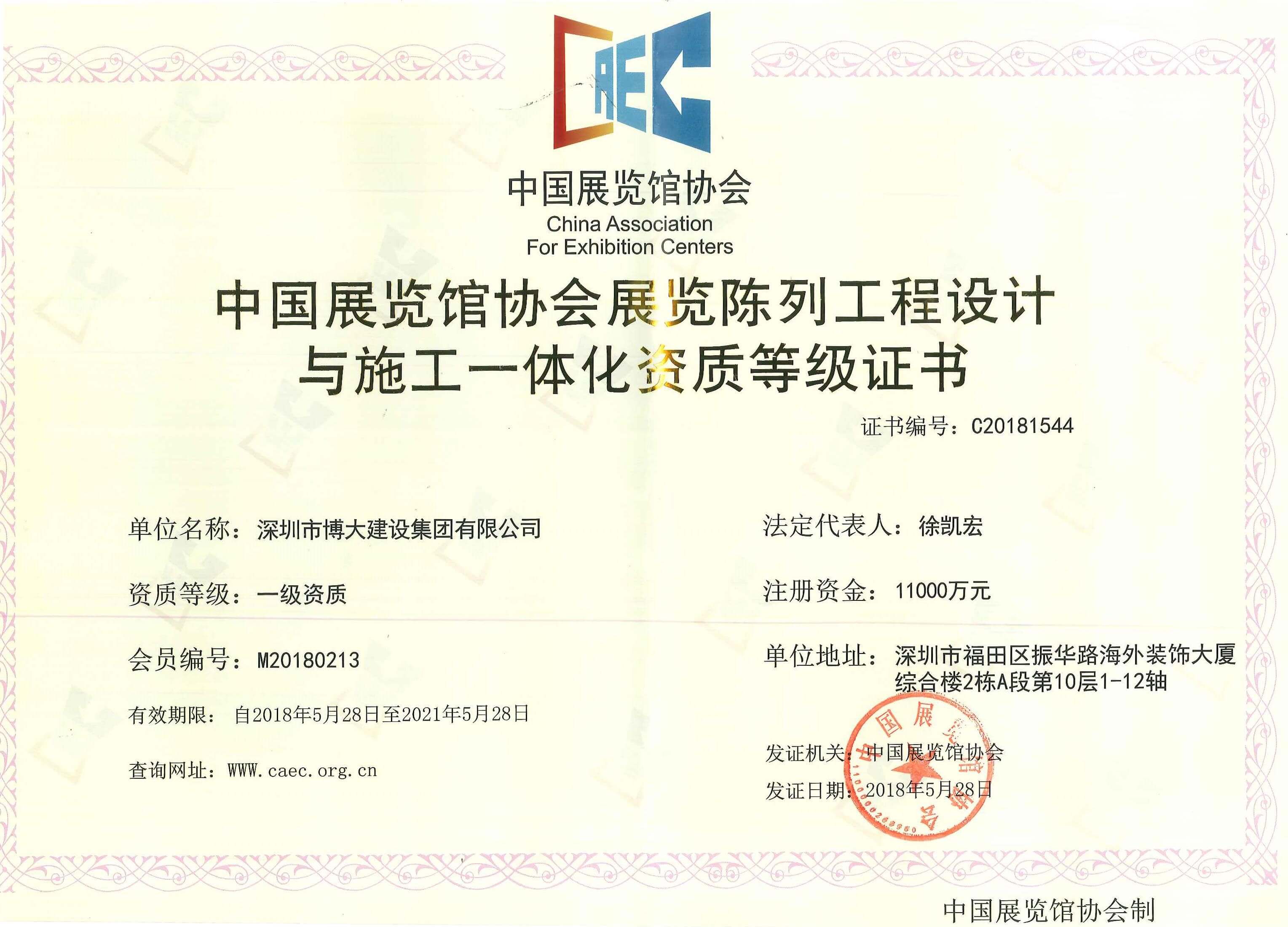 博大建設(shè)集團(tuán)作為行業(yè)最具發(fā)展活力的企業(yè),近年來(lái)以迅猛的成長(zhǎng)速度,得到了越來(lái)越多的關(guān)注和認(rèn)可。在各級(jí)領(lǐng)導(dǎo)的關(guān)懷和全體家人的共同努力下,集團(tuán)資質(zhì)建設(shè)取得新的進(jìn)展:獲得展覽工程企業(yè)一級(jí)資質(zhì),展覽陳列工程設(shè)計(jì)與施工一體化一級(jí)資質(zhì)。
