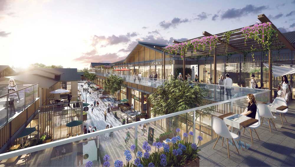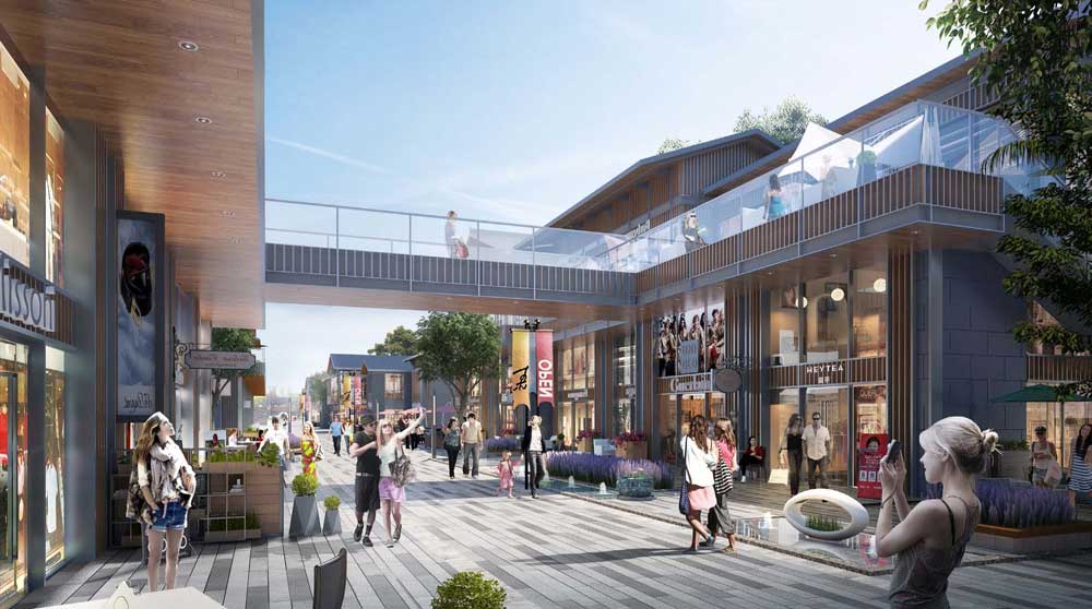 商業街外立面選用仿木型材及鋁板,屋頂采用琉璃瓦,將仿古建筑的歷史韻味和科技感、時尚感融為一體。