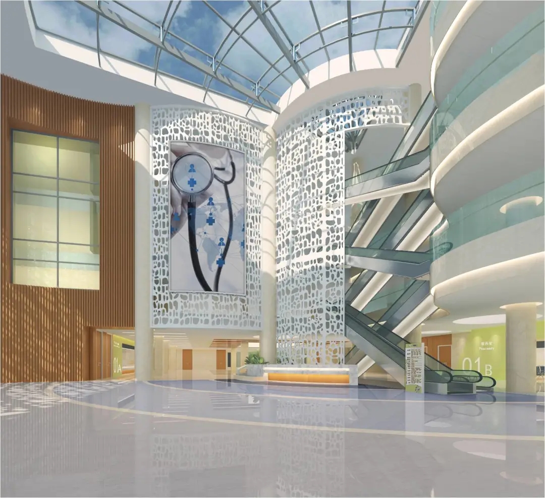 住院大廳天棚采用大面積玻璃采光頂,節(jié)約采光成本的同時營造廣闊的視覺空間。墻面采用仿石材瓷磚,與石材地面銜接,穿插氟碳烤漆鋼板柱子,通過對點線面的梳理,凸顯簡約、大氣、通透、現(xiàn)代化的視覺美感。