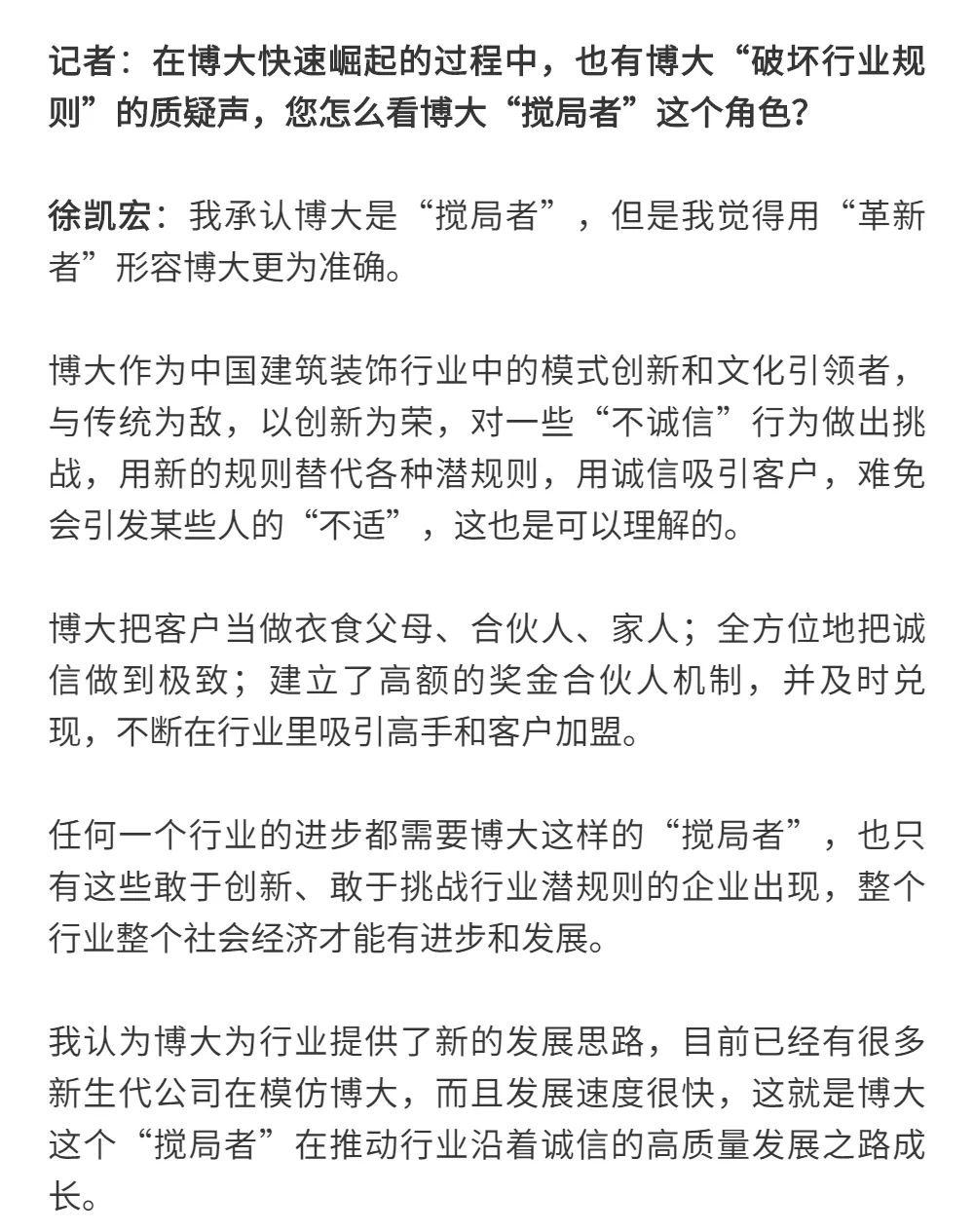 博大以雷霆之勢迅速崛起,吸引了行業的高度關注,行業權威媒體《中華建筑報》數次深入博大一線調研走訪,并對創始人徐凱宏先生進行了坦誠的訪談,以探討和總結博大發展的秘籍,并寫就了《進擊的博大:從高速到高質量的創新逆襲》和《對話徐凱宏 | 博大正沿著高質量發展道路堅定前行》兩篇文章。