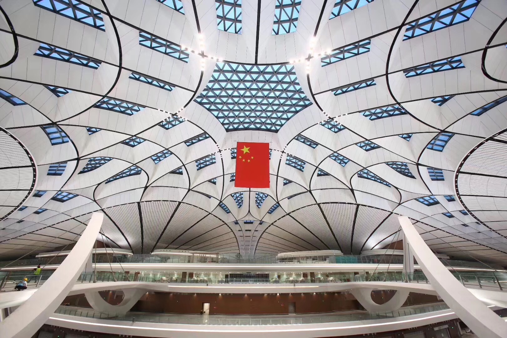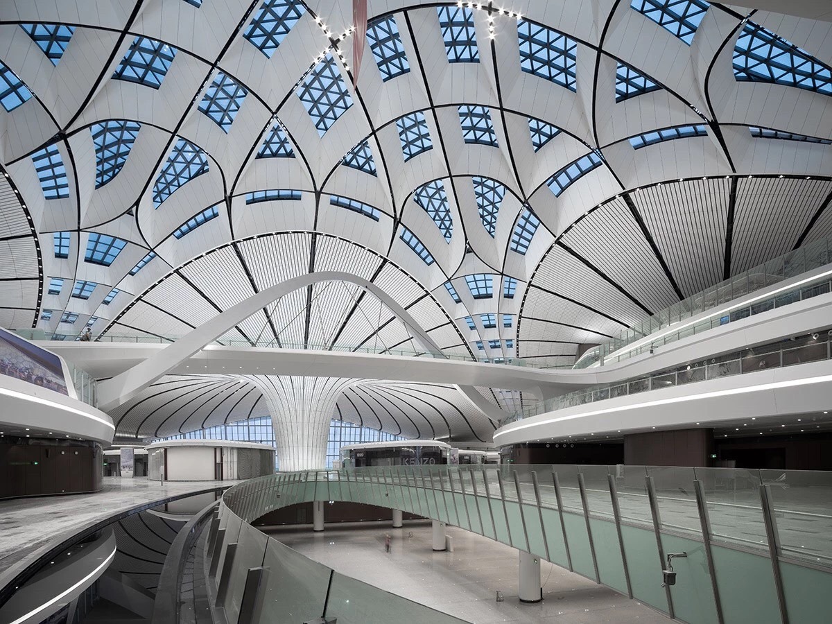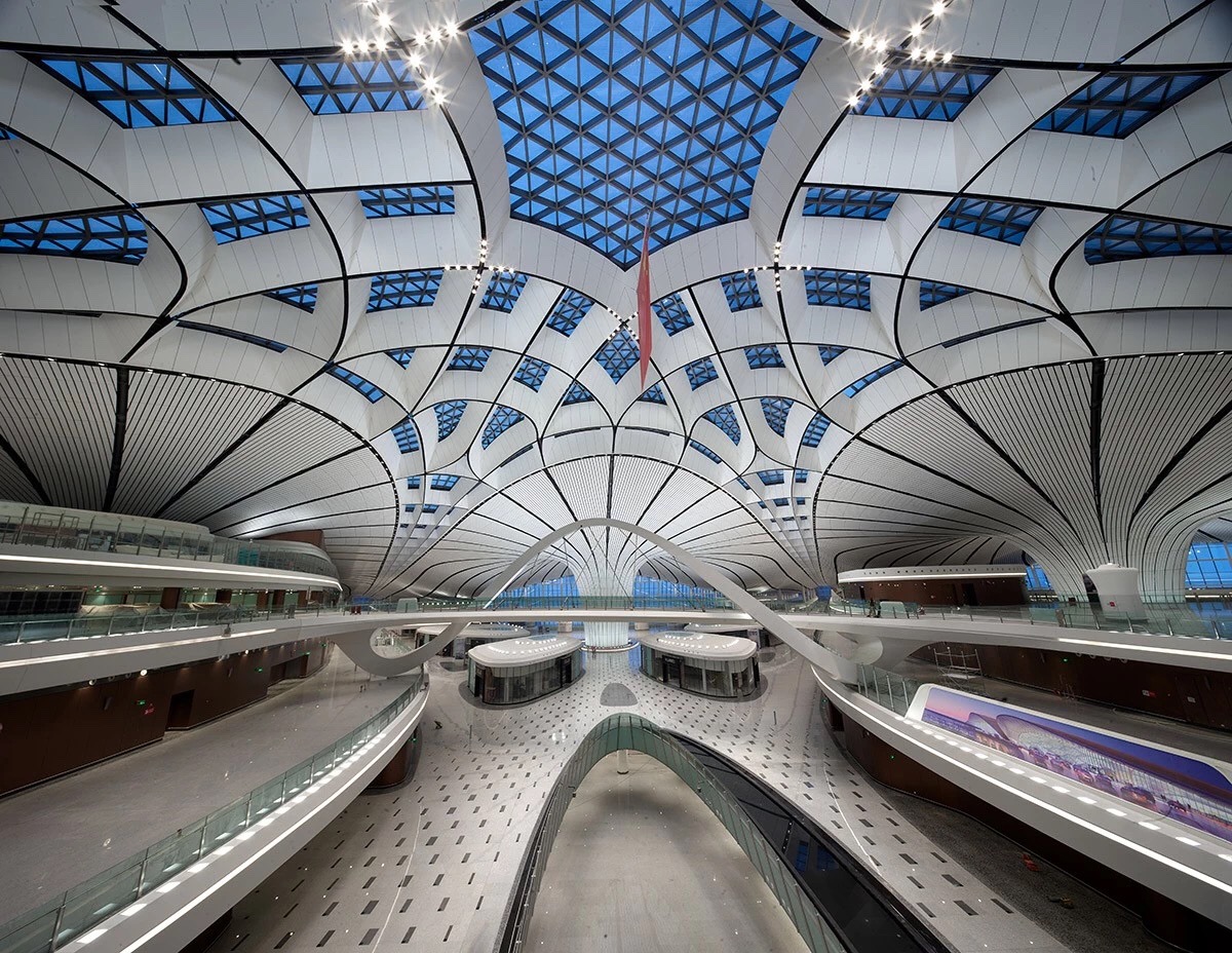 北京大興國際機場航站樓形如展翅的鳳凰,五指廊的造型完全以旅客為中心。整個航站樓有82個登機口,但是旅客從航站樓中心步行到達任何一個登機口,所需的時間不超過8分鐘。博大建設集團承建了中南指廊國際出發到達區域室內裝飾工程。